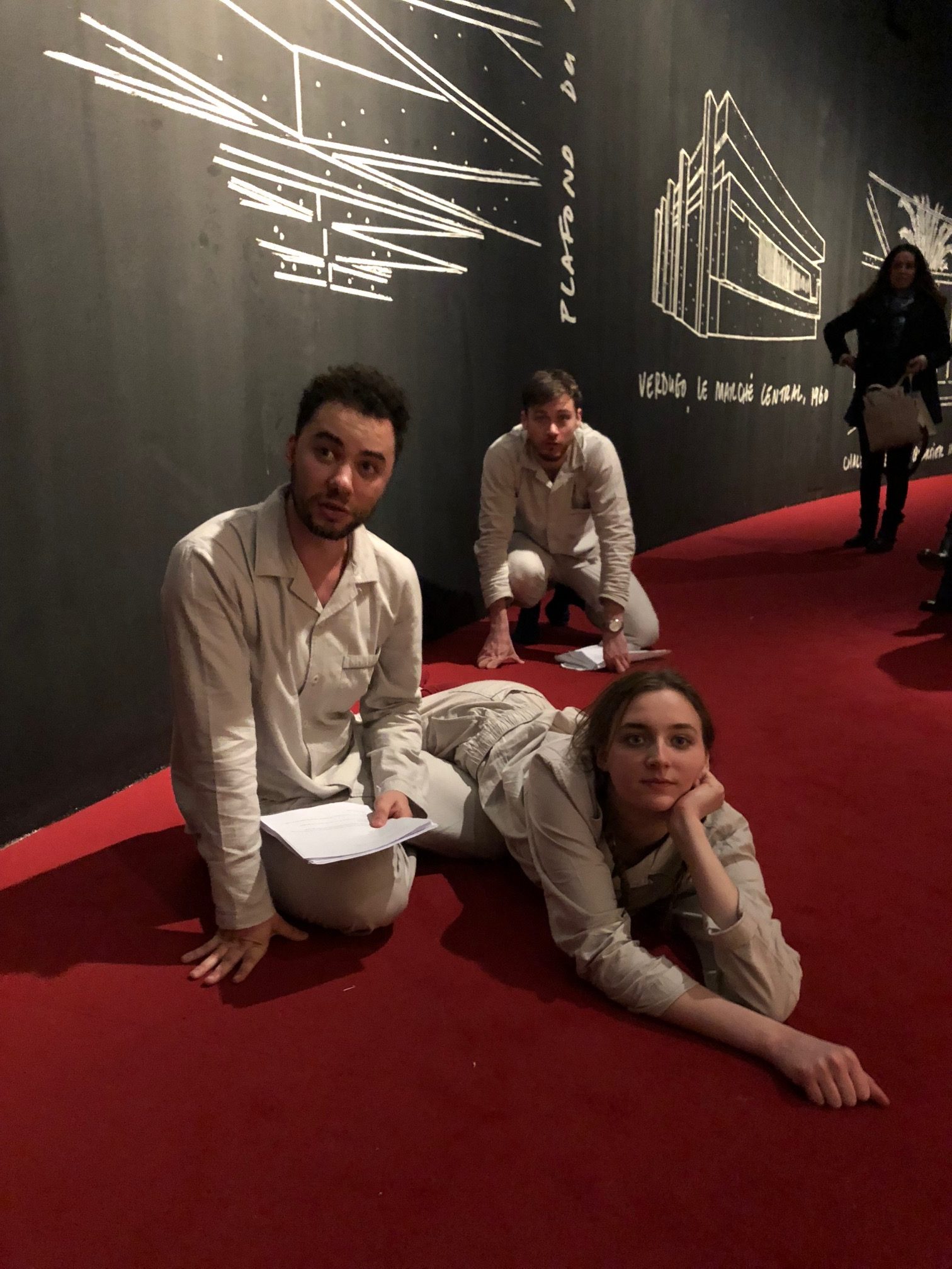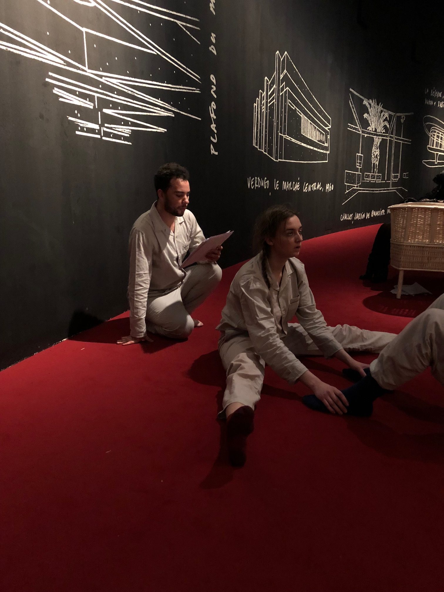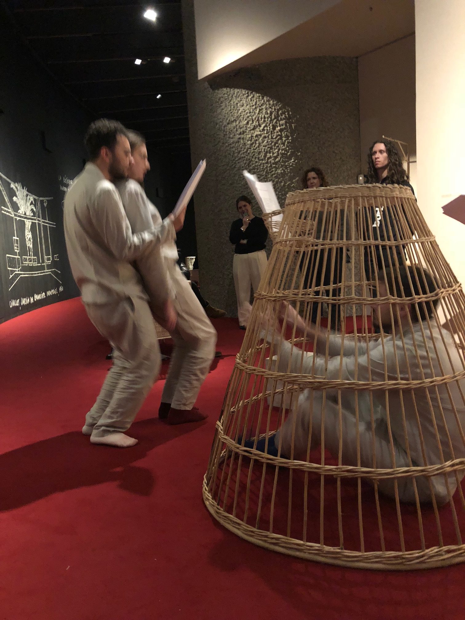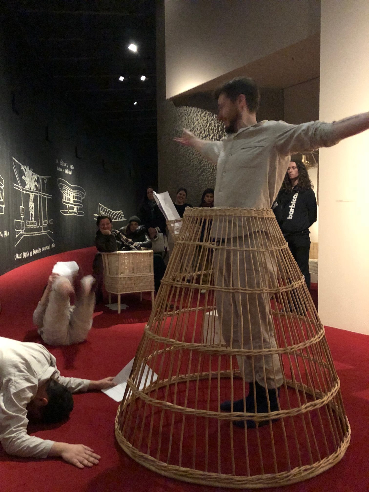 You sit on wickerwork chairs at different points up and down the space and listen to recordings of parts of the novel read (very well) by actors coming from speakers hidden within the woven rattan material.